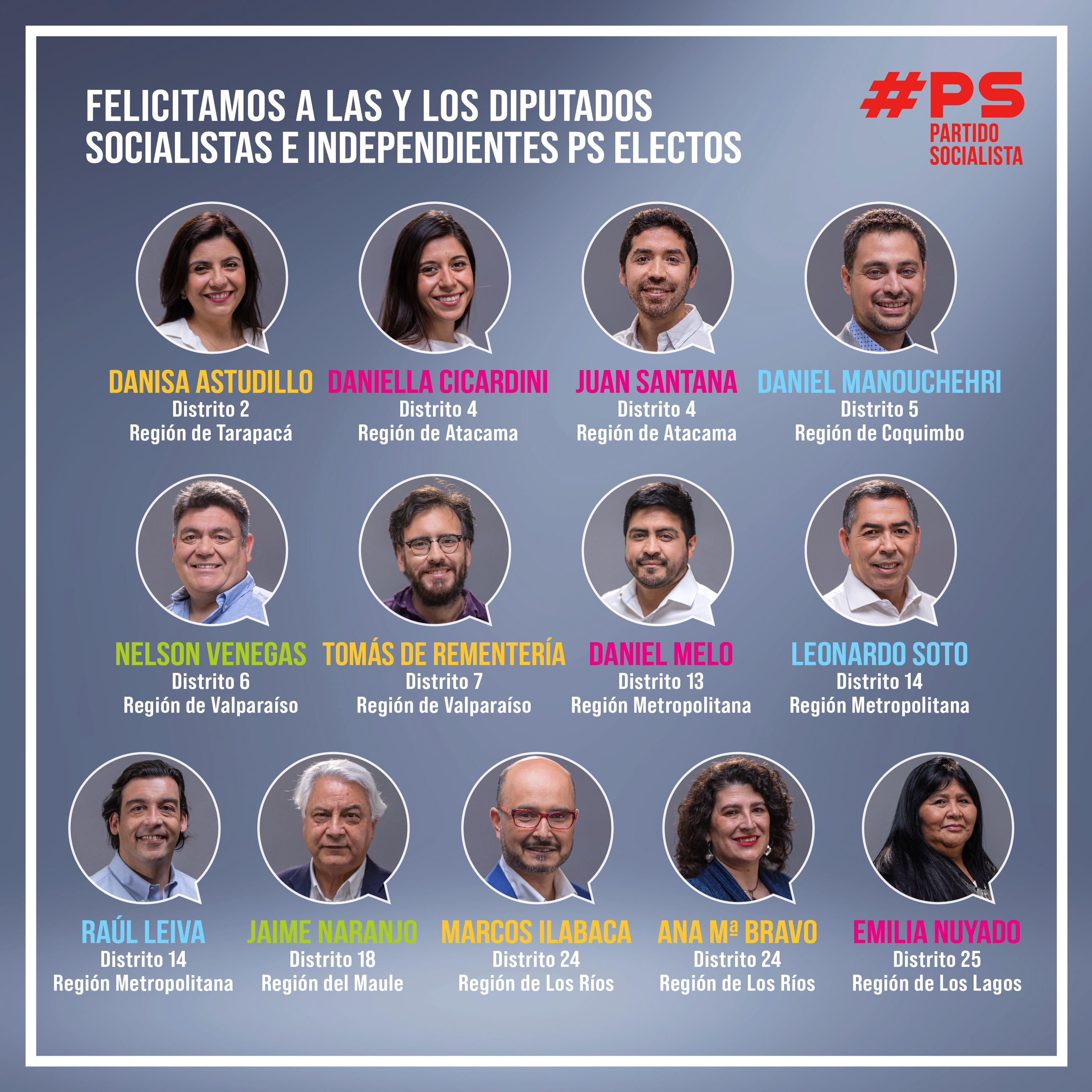 Por su parte, a la Cámara de Diputados arribarán Danisa Astudillo, por el Distrito 2; Daniel Manouchehri, por el Distrito 5; Nelson Venegas, por el Distrito 6; Tomás De Rementería, por el Distrito 7; Daniel Melo, por el Distrito 13, y Ana María Bravo, por el Distrito 24. Mientras, fueron reelectos Daniella Cicardini y Juan Santana, por el Distrito 4; Leonardo Soto y Raúl Leiva, por el Distrito 14; Jaime Naranjo, por el Distrito 18; Marcos Ilabaca, por el Distrito 24, y Emilia Nuyado, por el Distrito 25.