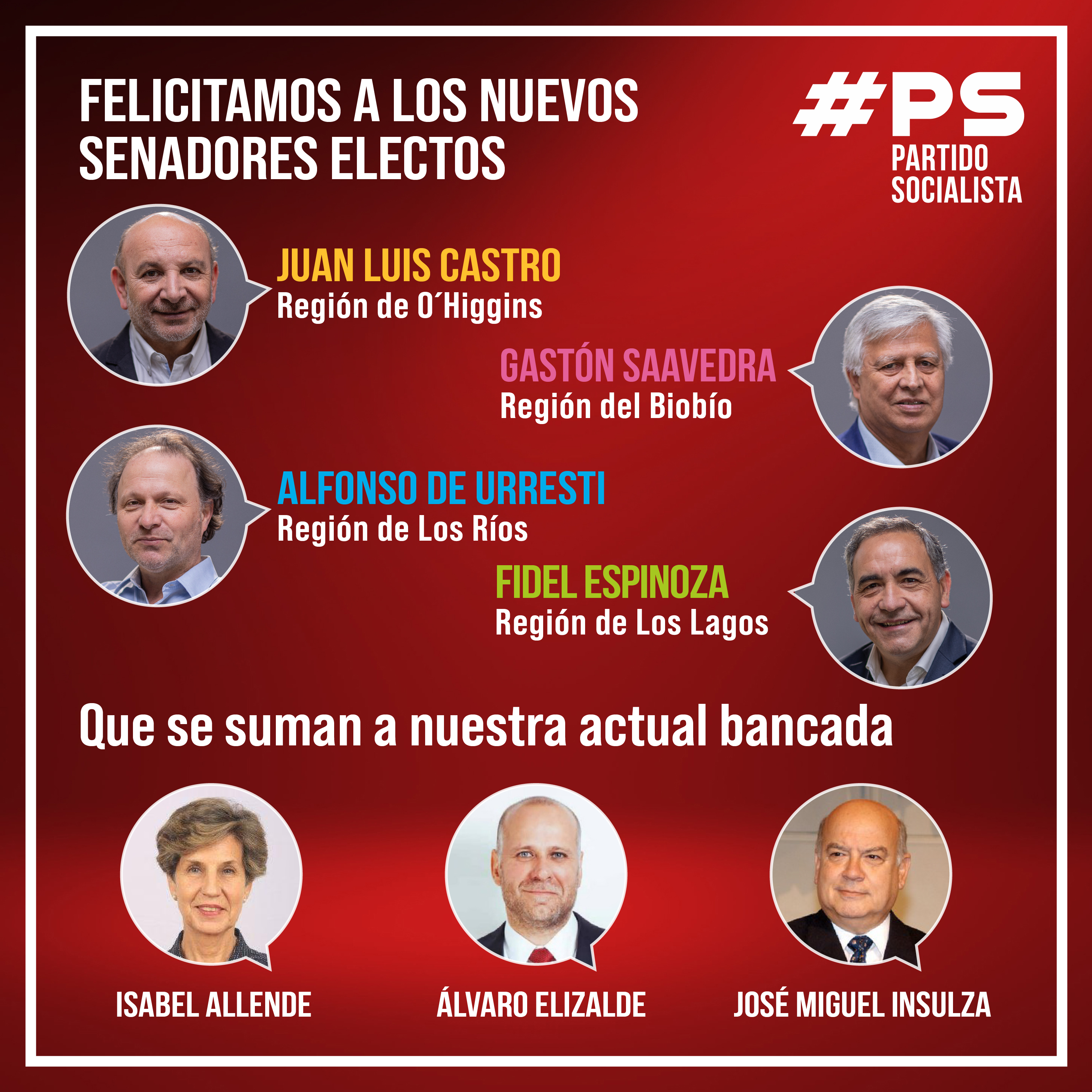 Quienes llegarán al Senado a partir de marzo de 2022 serán Juan Luis Castro, por la Región de O´Higgins; Gastón Saavedra, por la Región del BioBío, y Fidel Espinoza, por la Región de Los Lagos. Mientras, Alfonso De Urresti continuará por un período más representando a la Región de Los Ríos. Ellos se sumarán a los actuales senadores Isabel Allende, Álvaro Elizalde y José Miguel Insulza, haciendo un total de siete.