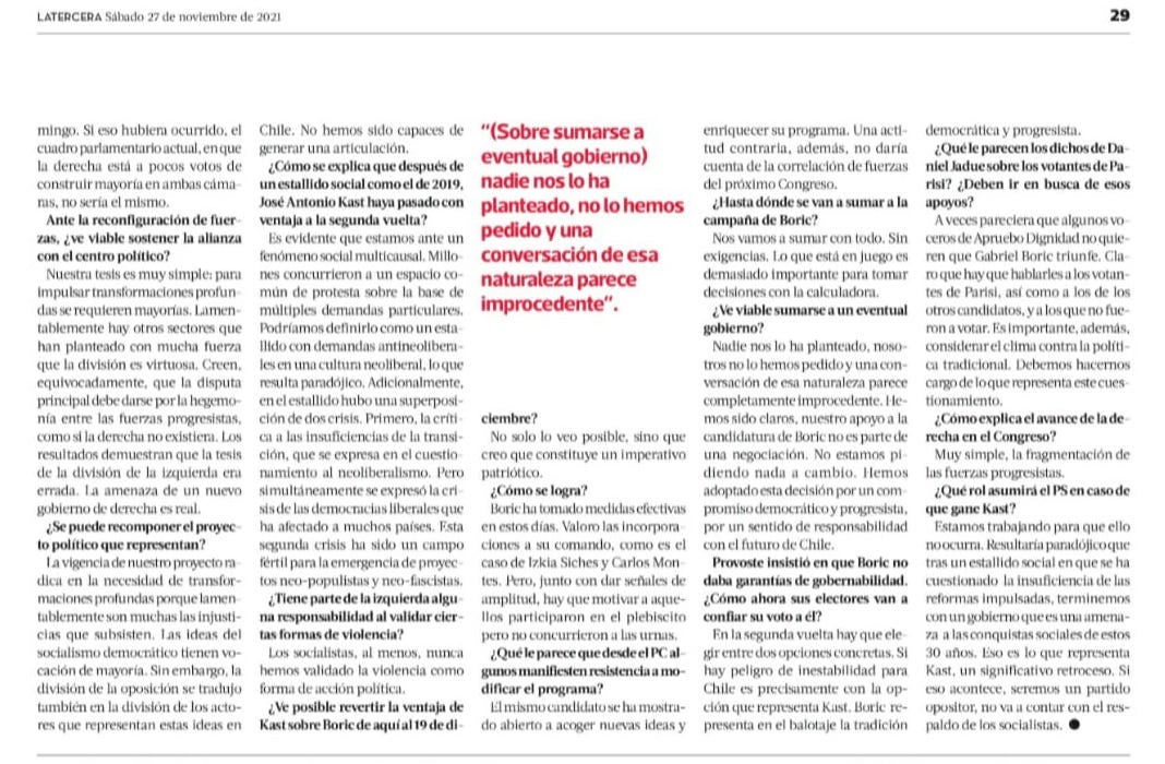 Respuesta: Nadie nos lo ha planteado, nosotros no lo hemos pedido y una conversación de esa naturaleza parece completamente improcedente. Hemos sido claros, nuestro apoyo a la candidatura de Boric no es parte de una negociación. No estamos pidiendo nada a cambio. Hemos adoptado esta decisión por un compromiso democrático y progresista, por un sentido de responsabilidad con el futuro de Chile.
